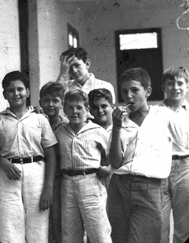 Юный Фидель Кастро с леденцом вместе со своими одноклассниками, учениками школы в Сантьяго, Куба, 1940 год.