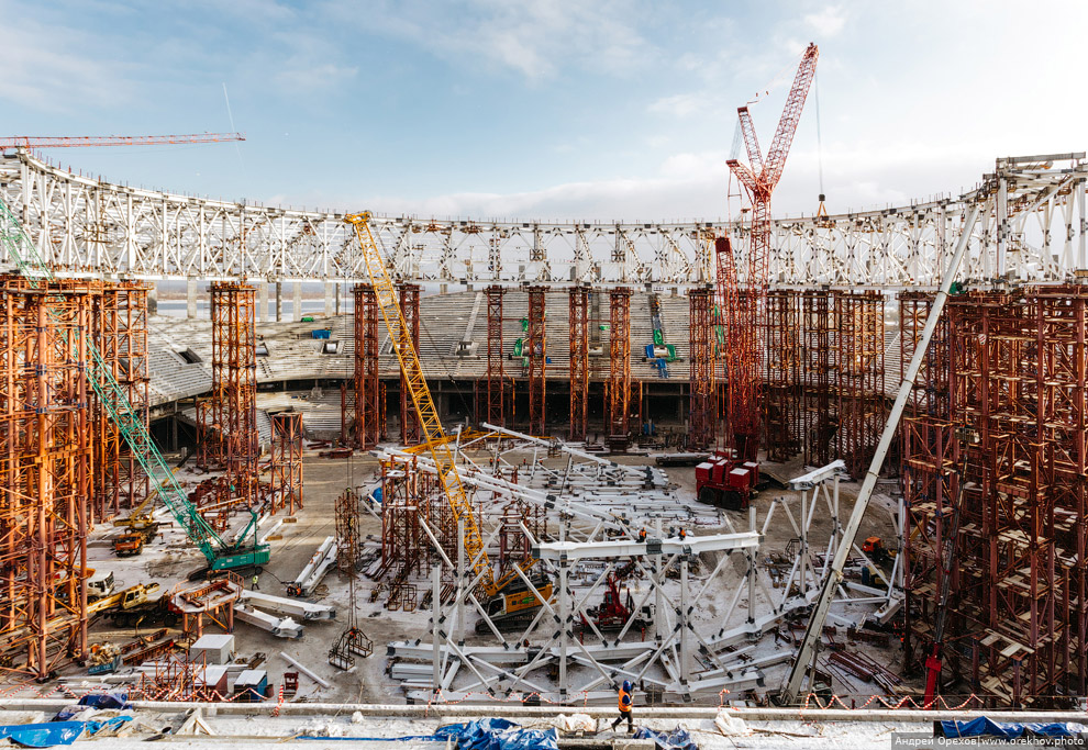 У бразильцев, помнится, четыре года назад была похожая ситуация. Так они стадион в Сан-Паулу достраивали уже после начала турнира. БигПикча изучила, как обстоят дела на строительных площадках отечественных домов футбола, и с удивлением обнаружила, что значительных поводов для беспокойства практически нет. Убедитесь сами.