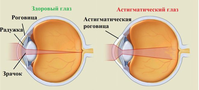 Не перепутайте. Да-да, именно справа ночная дорога глазами здорового человека. Подпись под фото объясняет суть проблемы: при астигматизме роговица имеет не правильную округлую форму, а вытянута вперед. Из-за этого изображение несколько искажается.
